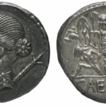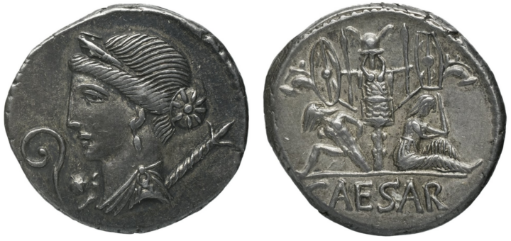 Denier frappé par César avec des esclaves gaulois (RRC 468/2), BnF, REP-13016 Armes sur le trophée entouré de carnyx (trompes de guerre)