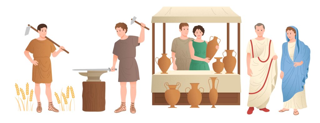 Paysans, artisans commerçants propiétaires terriens sont la base de la société romaine. (dessin C. Perrier)